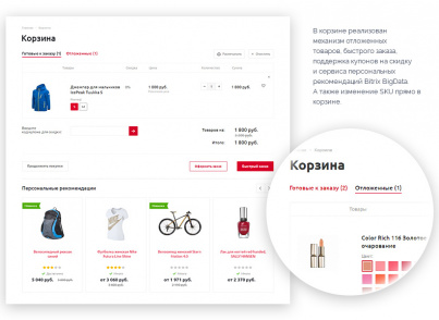 - Персонализация для повышения конверсий: блоки «Персональные рекомендации» и «Похожие товары», подписка на акции и другие возможности для разных групп пользователей.